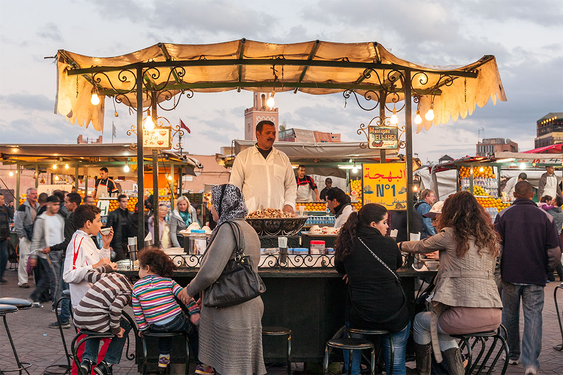 Epicentro da cidade antiga e Património da Humanidade, a praça é hoje uma referência do que Marraquexe já foi em tempos idos. Tendas fumegantes saciam a fome de quem passa, com inúmeros manjares e sumos de laranja espremidas à nossa frente.